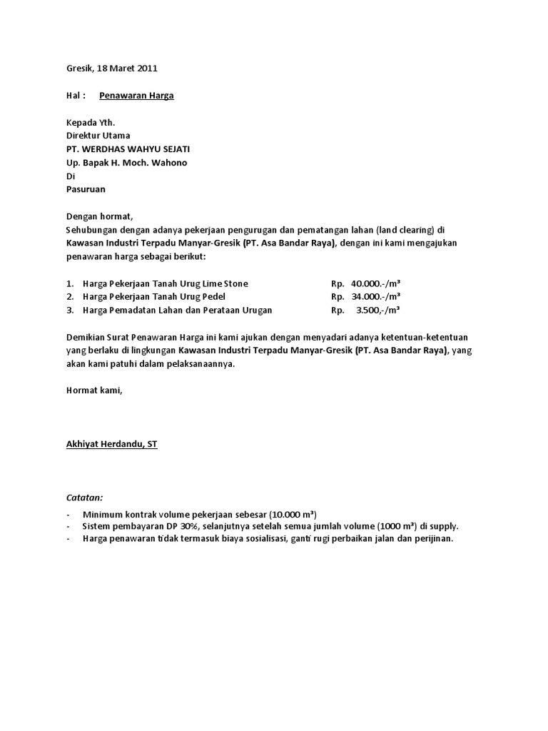 Untuk mendapatkan respon yang baik dari calon pelanggan, maka anda harus bisa memberikan penawaran harga yang menarik. Apalagi jika surat tersebut merupakan surat berharga seperti ini, kita harus tahu apa saja yang harus ada dan bagaimana bentuk penulisannya. Perkenankanlah terlebih dahulu kami ucapkan terima kasih atas kesempatan yang diberikan. Savesave contoh surat penawaran harga tanah for later. Seperti yang sudah disingging di atas, pada dasarnya, surat ini hampir mirip. 3.790 m2 status tanah : Contoh surat penawaran jasa dengan harga negoisasi. Perkenankanlah terlebih dahulu kami ucapkan terima kasih atas kesempatan yang diberikan kepada kami untuk menawarkan sukabumi, 25 agustus 2008 yang membuat, pemilik tanah. Contoh surat penawaran harga untuk lelang. Sertifikat hak milik harga negosiasi : Tapi, si calon pembeli tidak membayar tunai melainkan menggunakan metode pembayaran pihak ketiga alias mau mengajukan kredit bank secara mandiri. Surat penawaran merupakan suatu surat yang ditujukan kepada suatu instansi yang bertujuan untuk menawarkan sesuatu. Pada saat jual beli produk, perlu ada kesepakatan soal metode pembayaran yang akan digunakan.